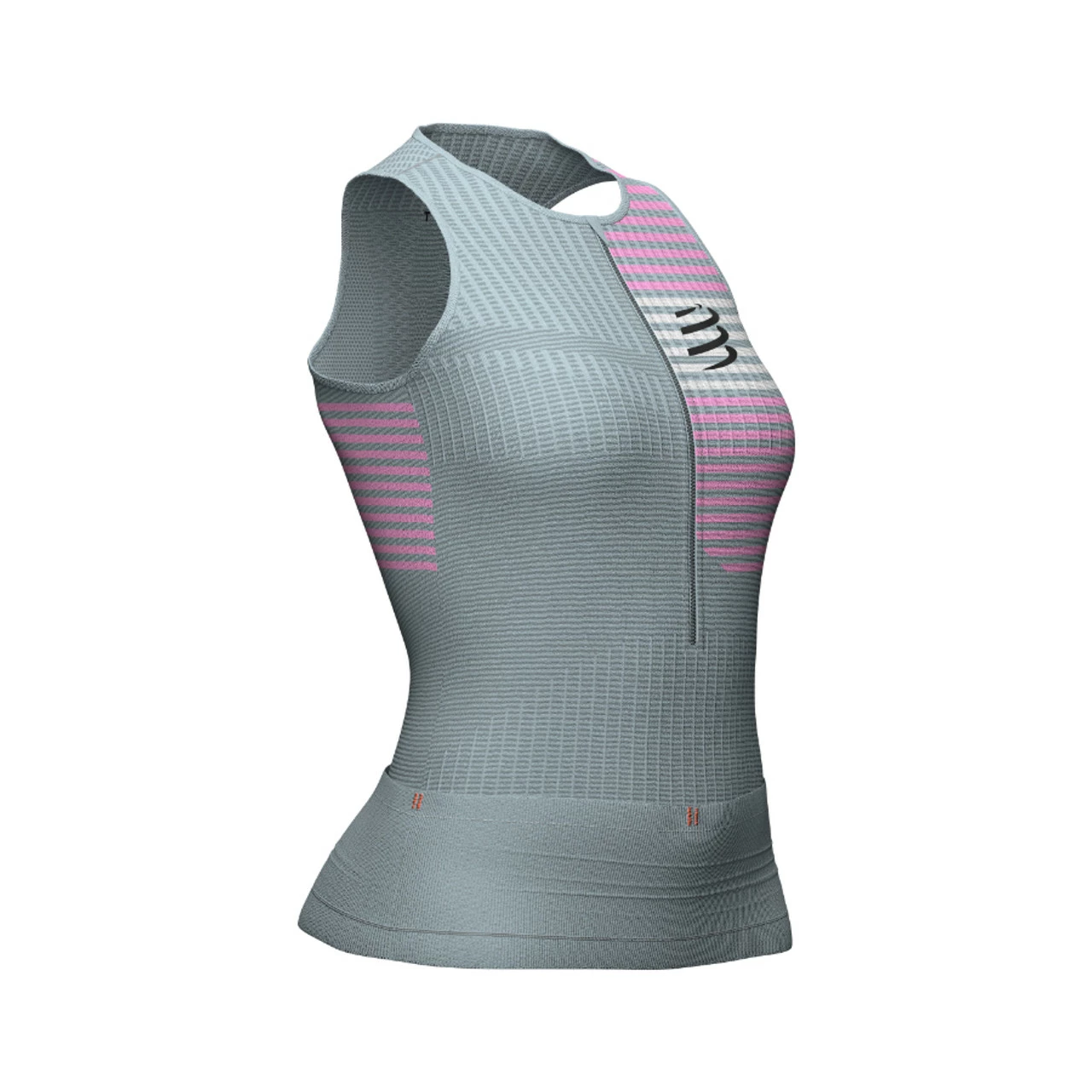 She chooses the women’s Compressport triathlon tank top because she feels the benefits of its unique posture control directly woven into its back and abdominal area.