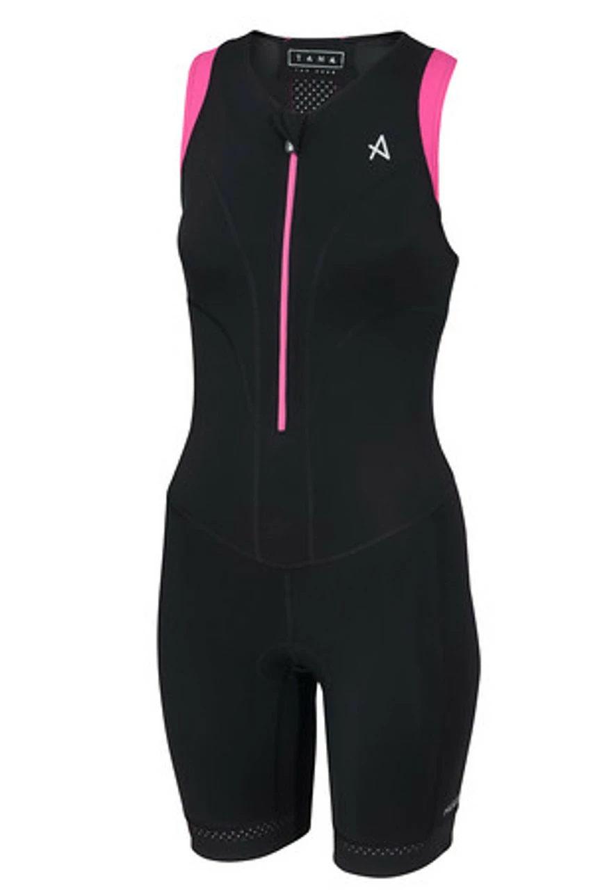 A striking Trisuit in black and pink, constructed from lightweight and breathable fabrics